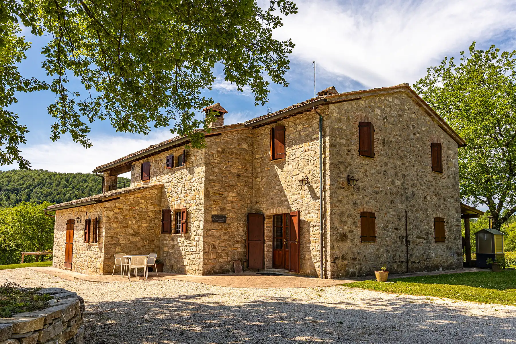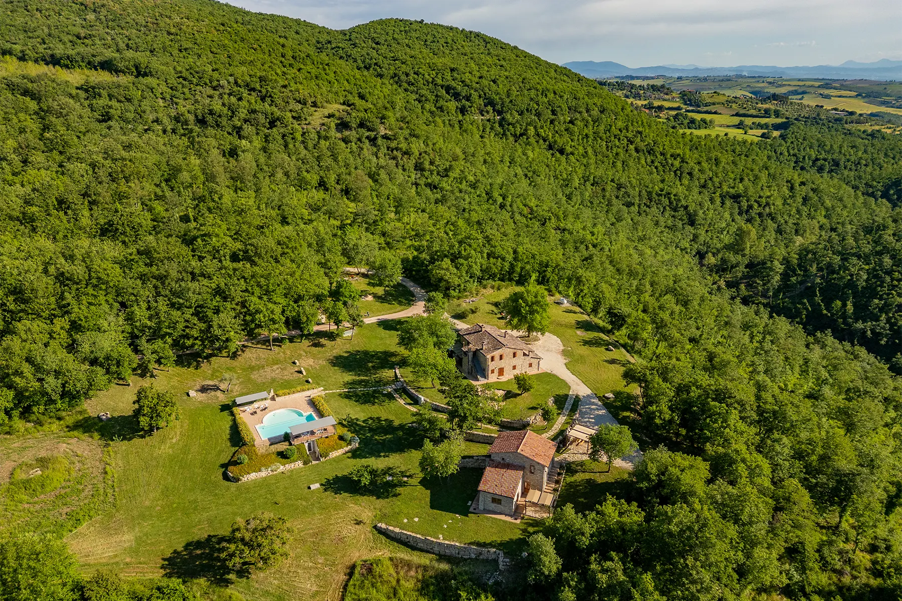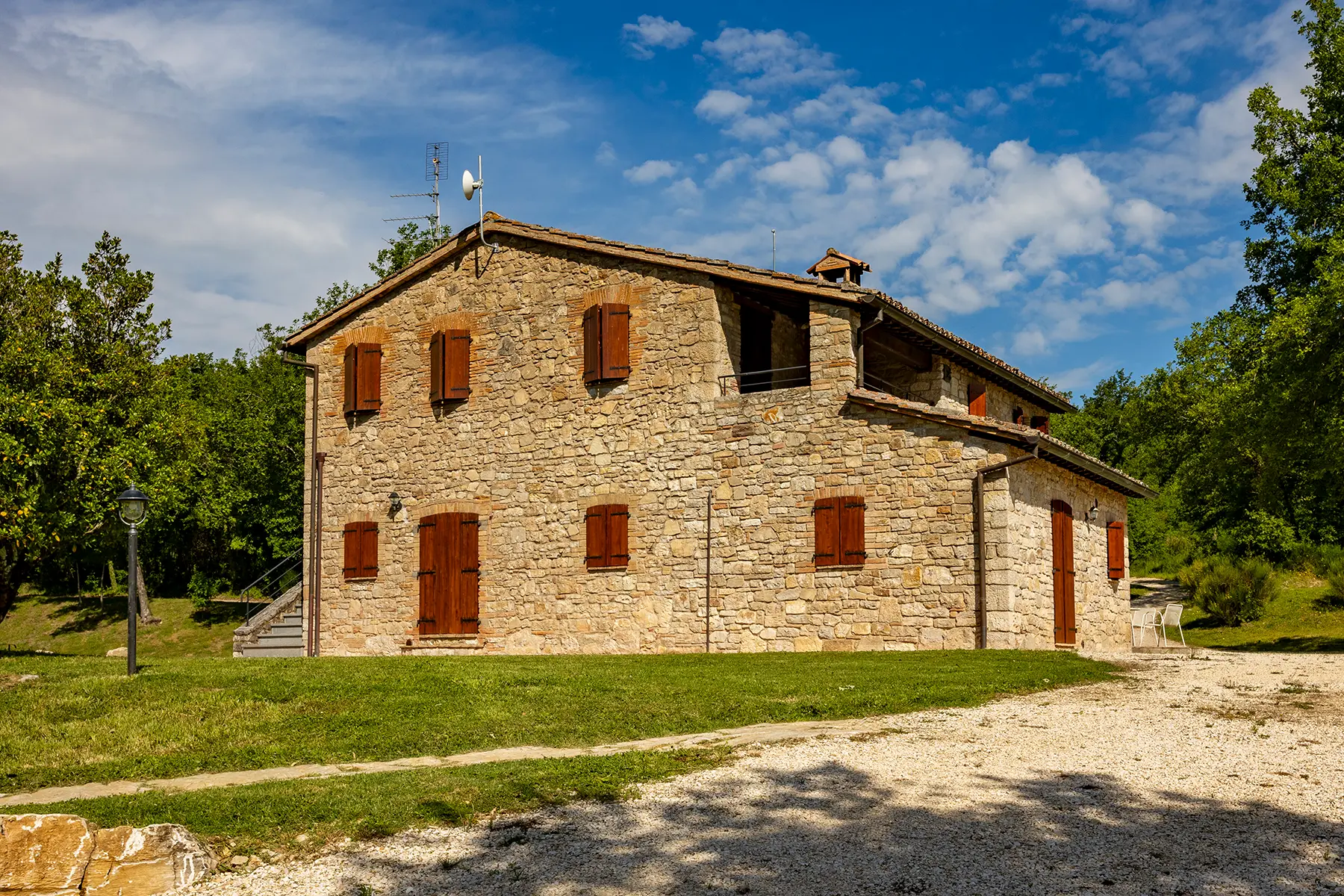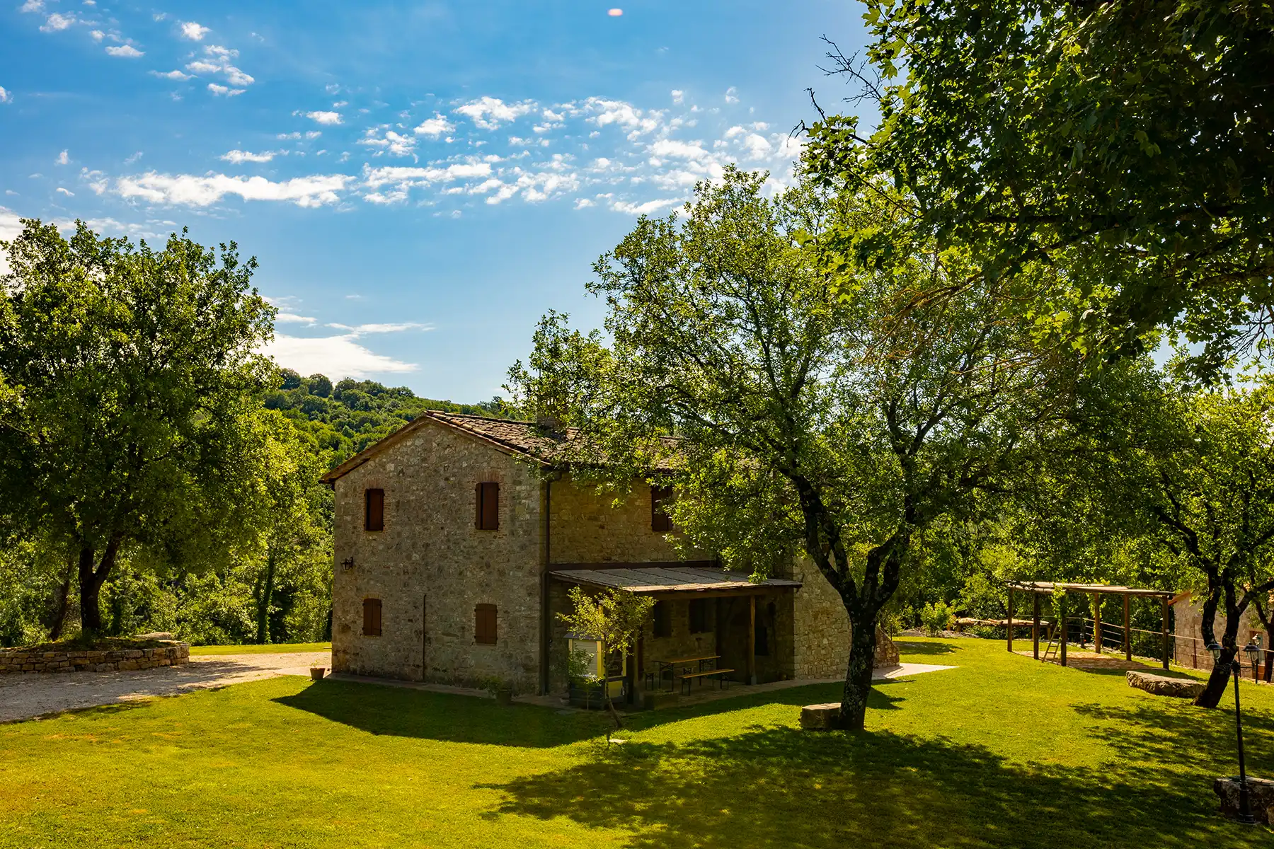 Situata a 350 mt sul livello del mare, ha un’estensione di circa 27 ettari la maggior parte dei quali si trova nel Comune di San Venanzo ed in piccola parte nel vicino Comune di Marsciano. I terreni aziendali sono stati lasciati incolti ed in stato di abbandono per oltre venticinque anni tanto che, al nostro arrivo, tutti gli appezzamenti, sulla carta coltivabili, si erano inselvatichiti. Le operazioni di ripulitura e rimessa in coltura, durate circa 7 anni, ci hanno permesso di recuperare un oliveto secolare e diversi appezzamenti di terreno su cui oggi coltiviamo foraggi per i nostri cavalli, ortaggi, frutta e piante micorrizzate per la produzione del tartufo nero estivo. E’ stato possibile, inoltre, trovare e ripristinare i vecchi muri a secco utilizzati un tempo per addolcire le pendenze e rendere possibile l’utilizzo dei terreni nonché ricavare, dalle pietre tolte dai campi, materiale da costruzione per ristrutturare uno dei due casali e costruire i muri a secco adiacenti l’agriturismo. La maggior parte della superficie aziendale è occupata da bosco ceduo all’interno del quale è possibile fare piacevoli passeggiate sfruttando i sentieri presenti, adatti a tutti. In azienda alleviamo api ligustiche, cavalli bardigiani, asini amiatini, pavoni e altri animali da cortile.